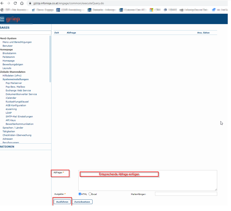 Dann sollte folgende Ansicht erscheinen und man die SQL-Abfrage auslösen kann.
