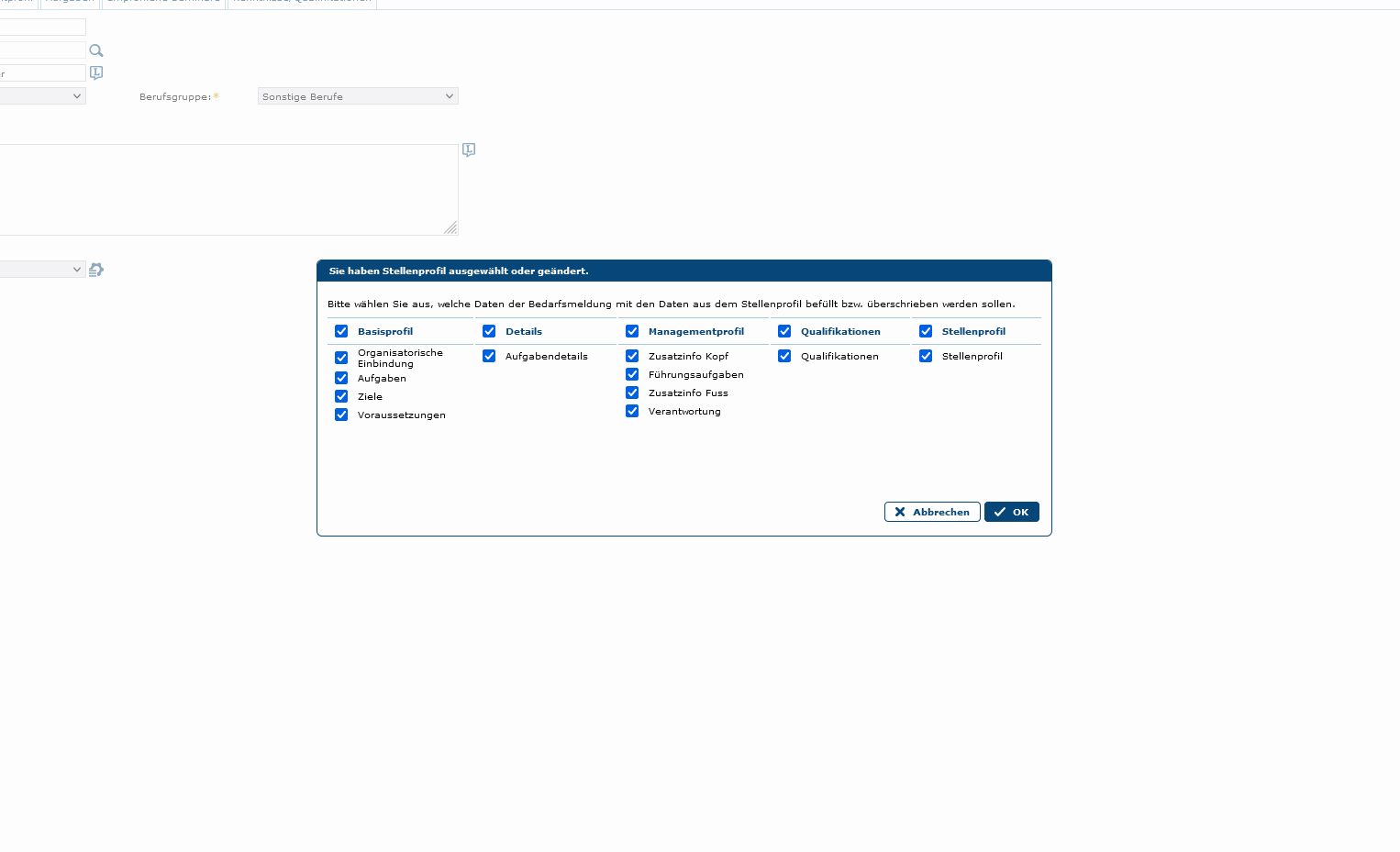 Die bei einer Bedarfsmeldung gespeicherten Stellenprofileinformationen können direkt aus einem Stellenprofil (Modul Organisation) auf die Bedarfsmeldung übertragen werden. Hierbei ist auch wichtig, dass das eigentlich hinterlegte Stellenprofil nicht automatisch überschrieben wird. Mit der Auswahl der Option „Stellenprofil“ in diesem Dialog kann jedoch das Stellenprofil bei der Bedarfsmeldung direkt aktualisiert werden.