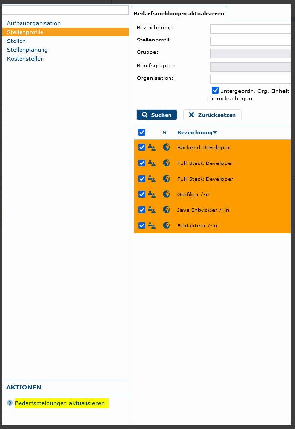 Mehrere Bedarfsmeldungen aus Stellenprofil heraus aktualisieren